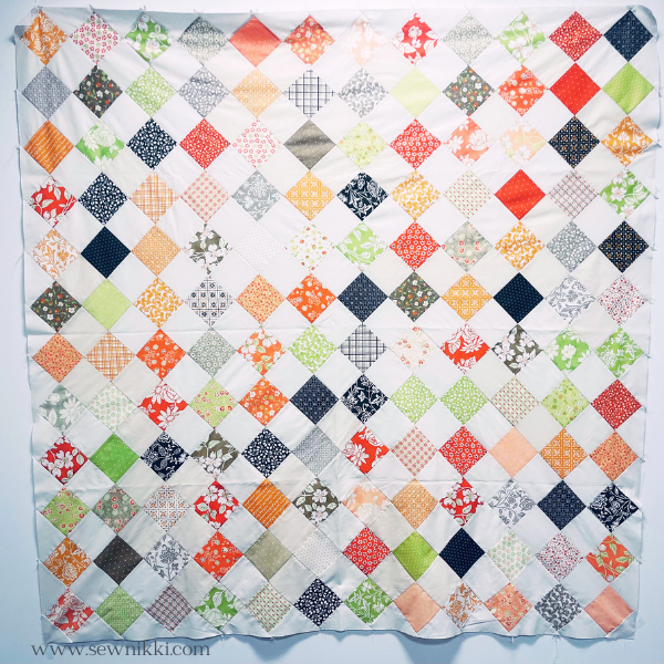 Finished charm square on point quilt measures 61 1/2″ x 61 1/2″.