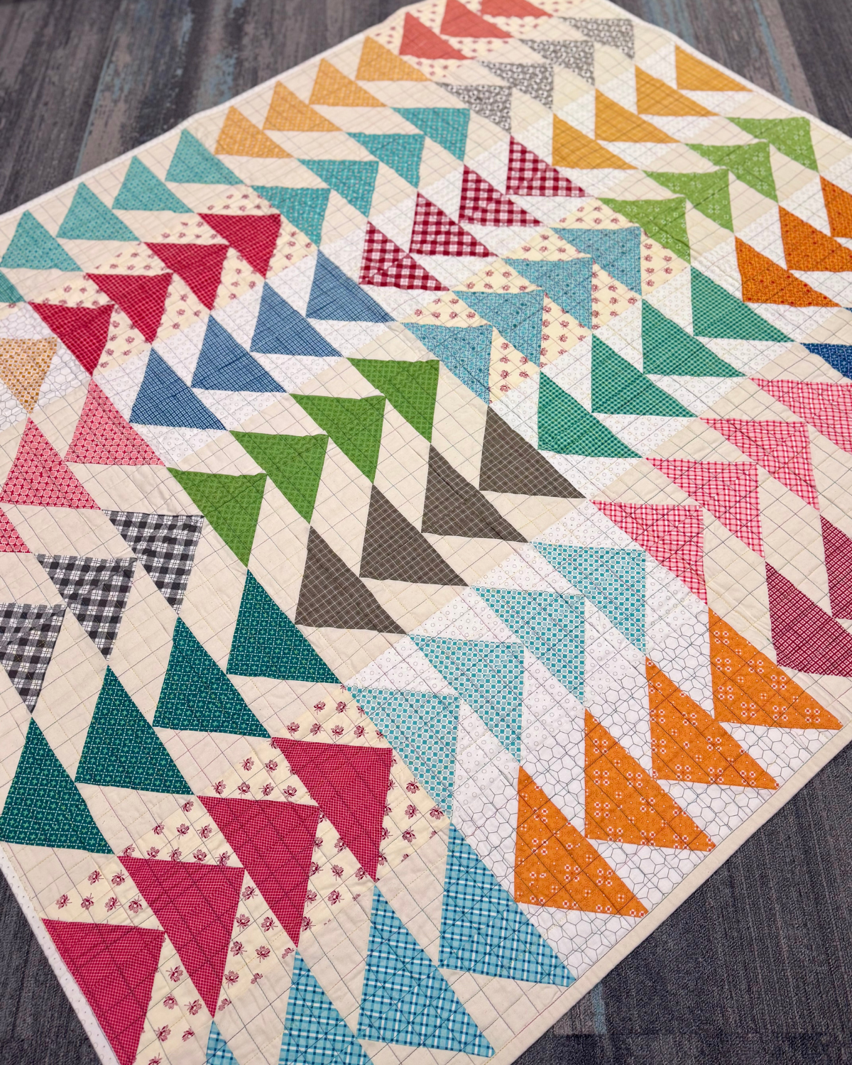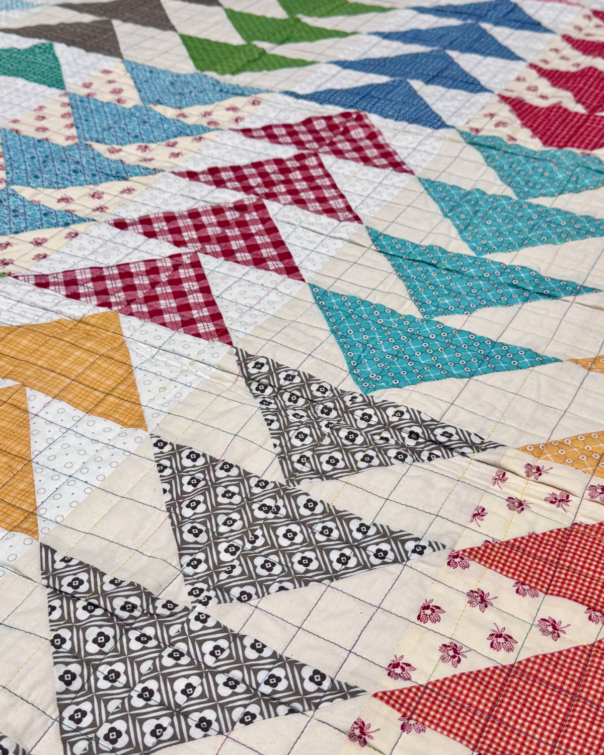 A handmade flying geese quilt with rows of colorful triangles on a soft neutral background. Perfect for the couch, end of the bed, or as a gift.